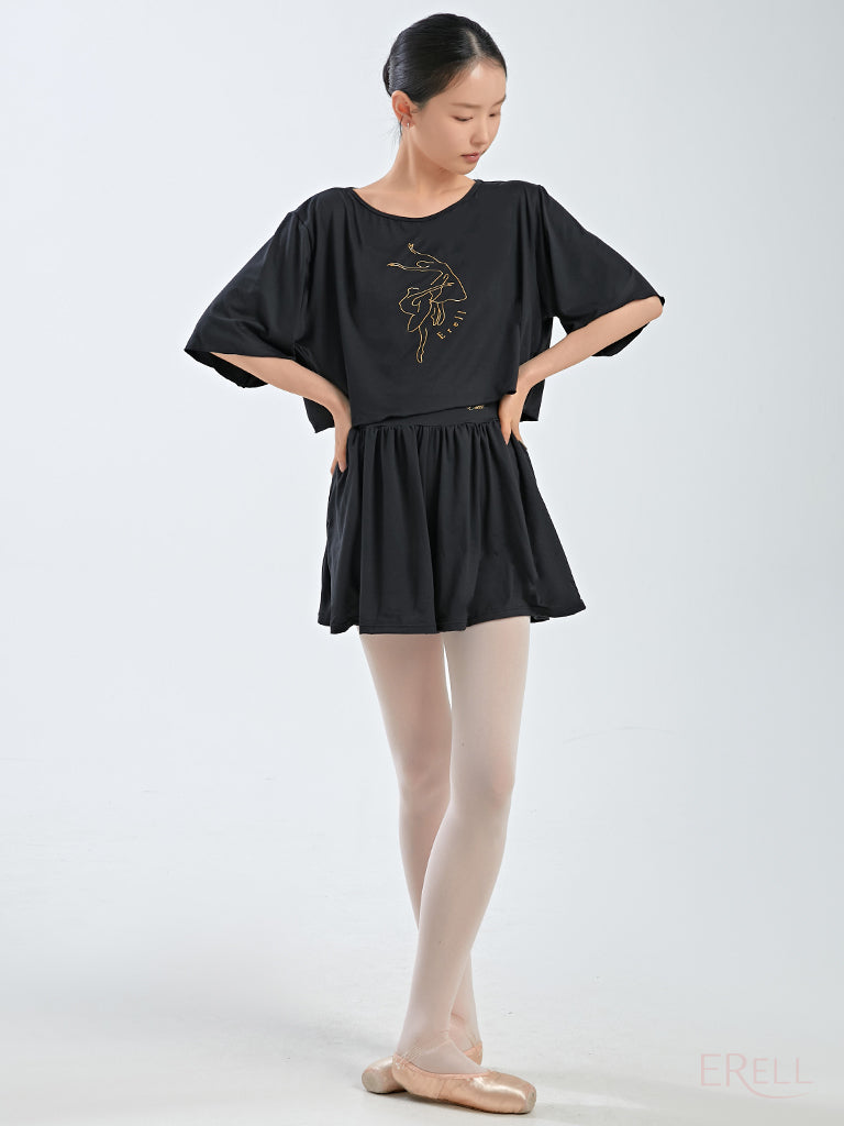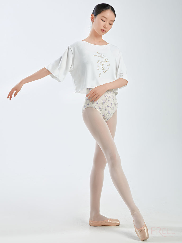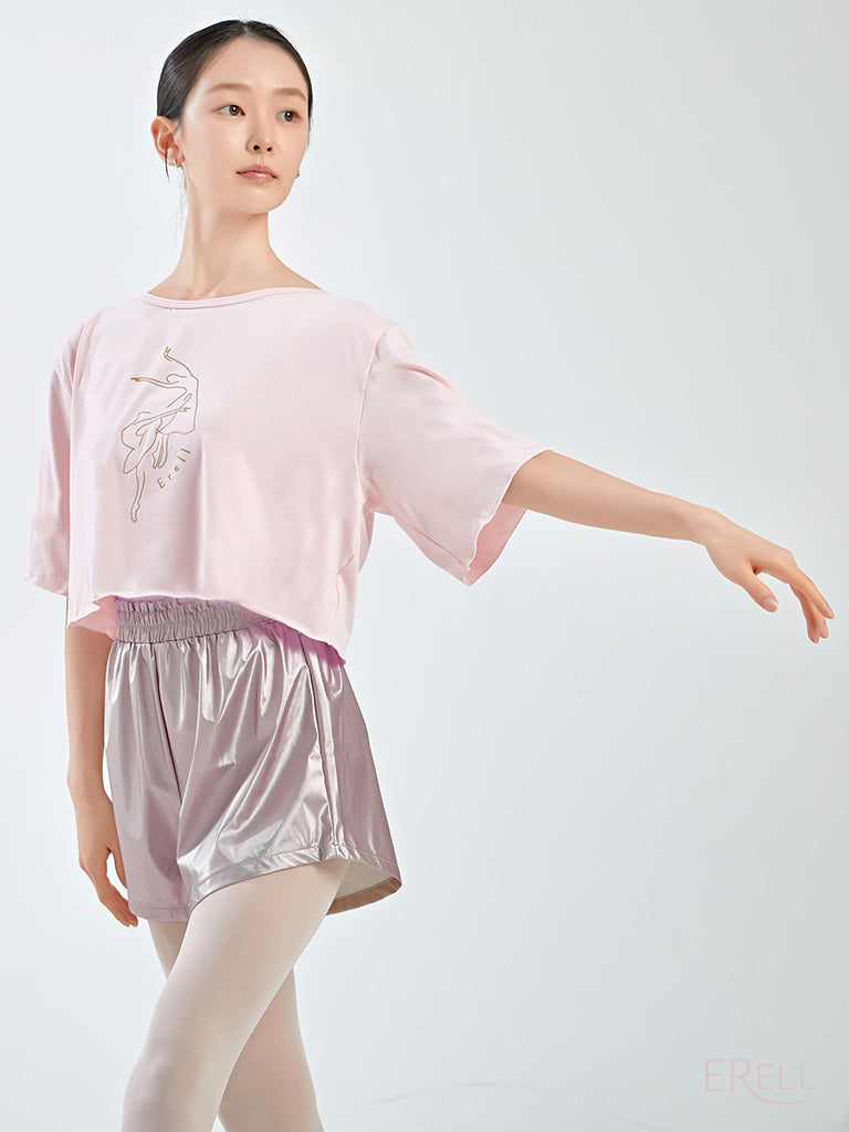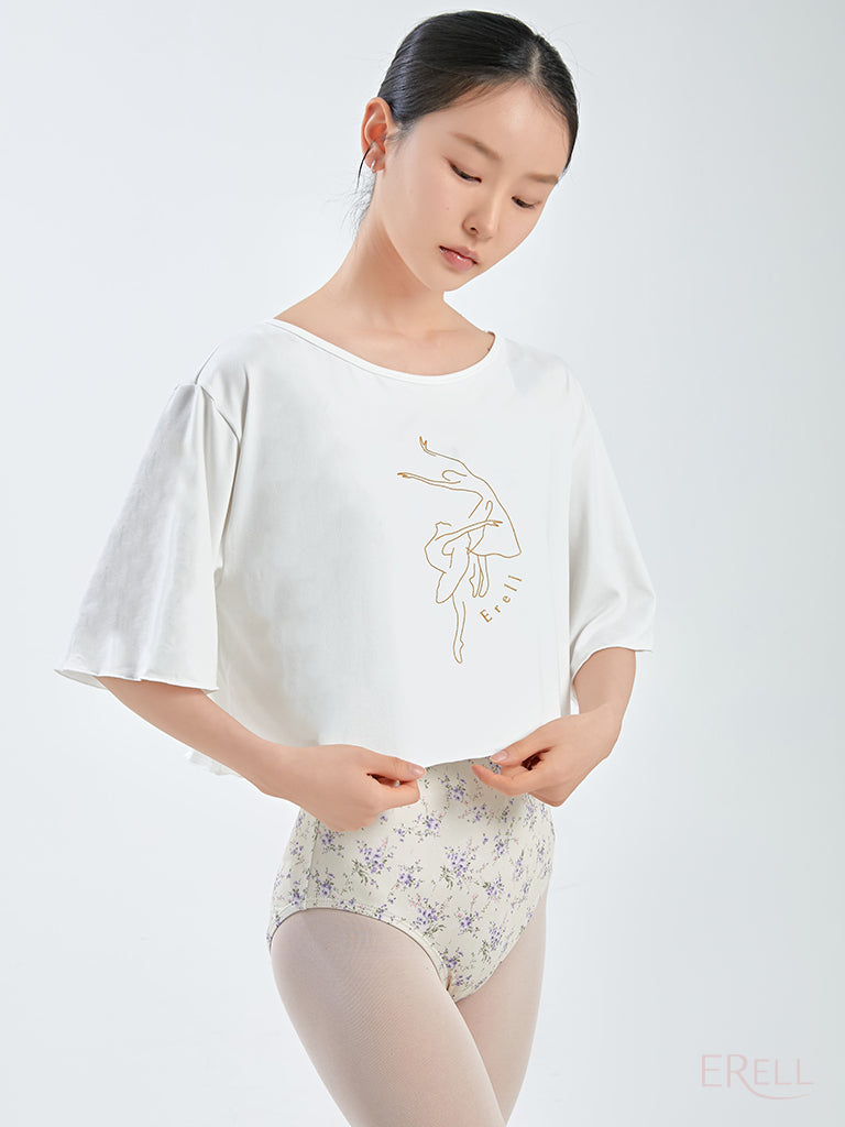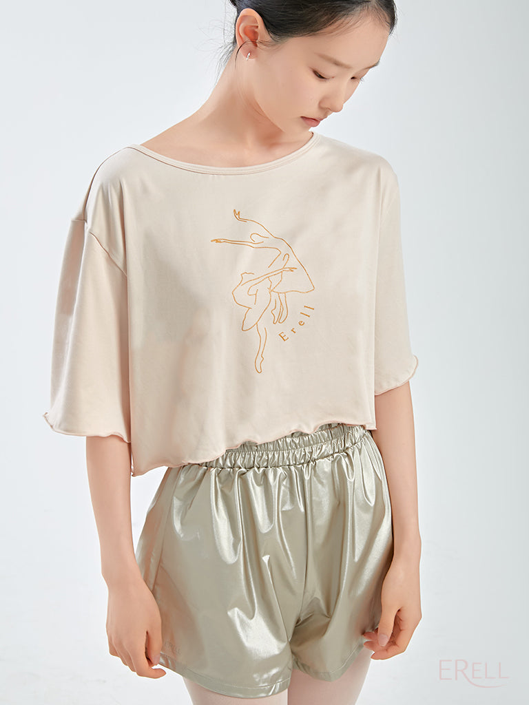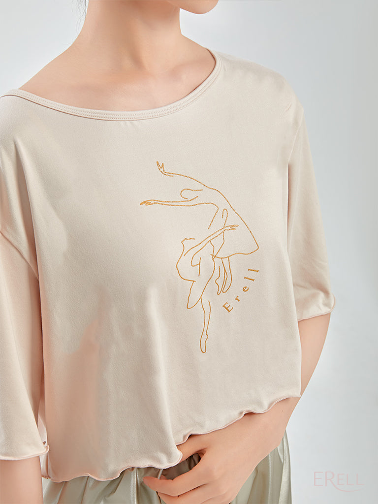 A loose-fit warmer top inspired by ballerinas, featuring a subtle gold print with a gentle shimmer.