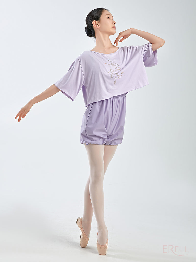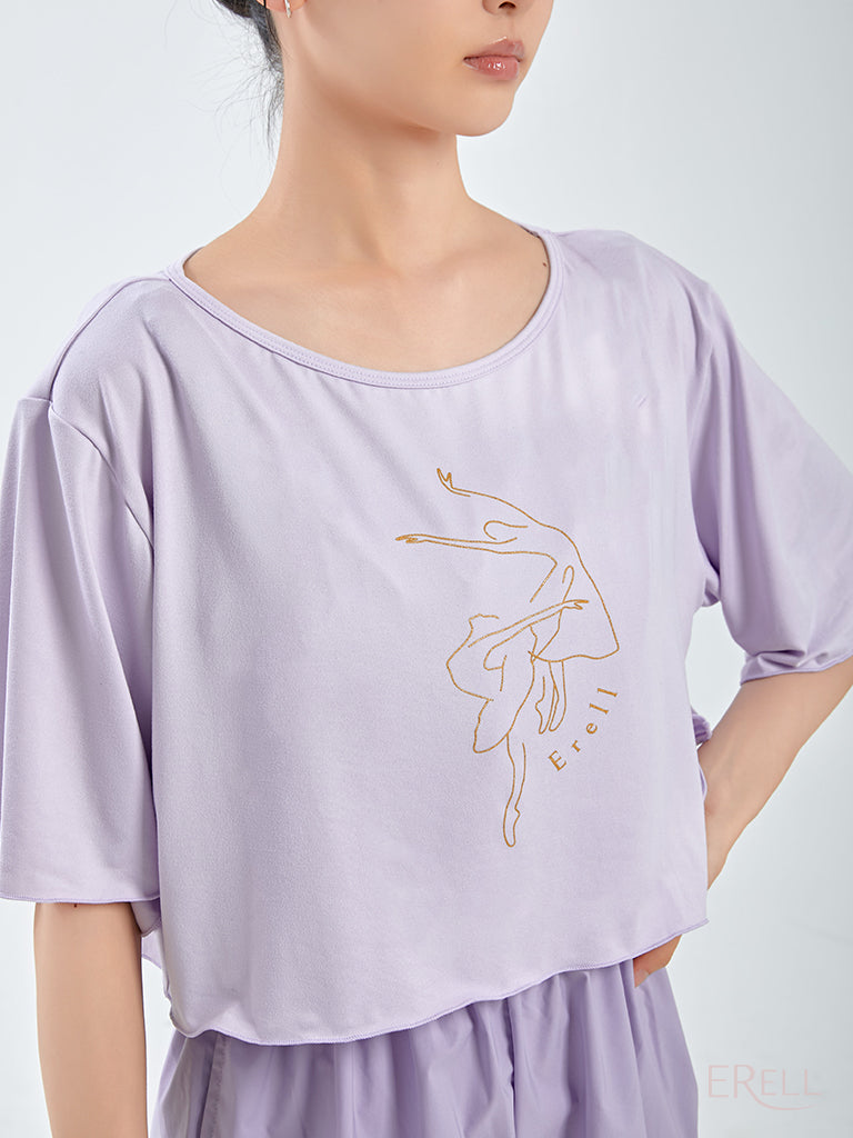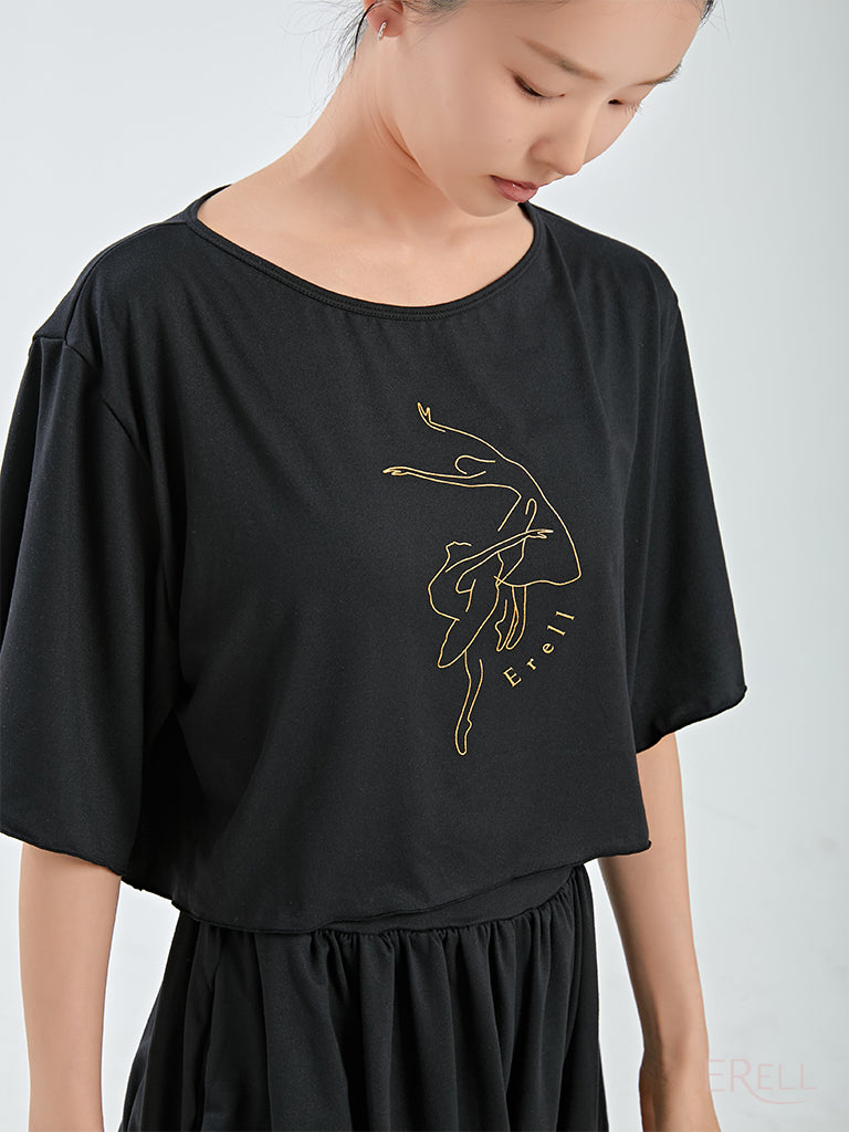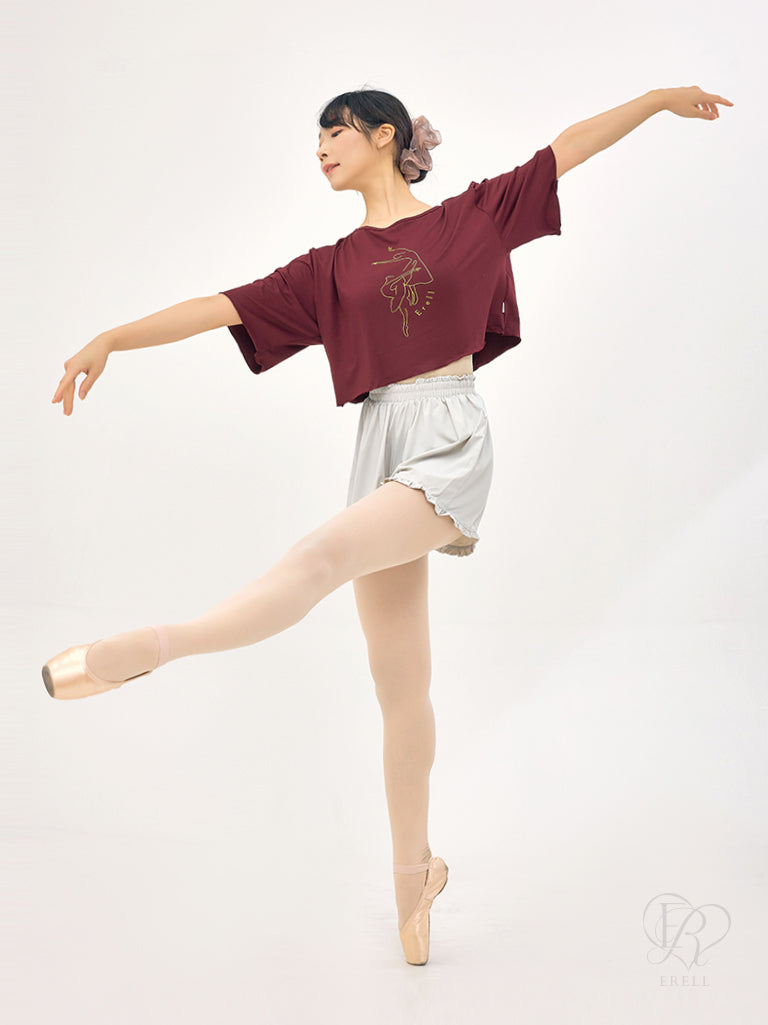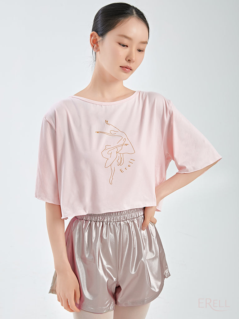 A loose-fit warmer top inspired by ballerinas, featuring a subtle gold print with a gentle shimmer.