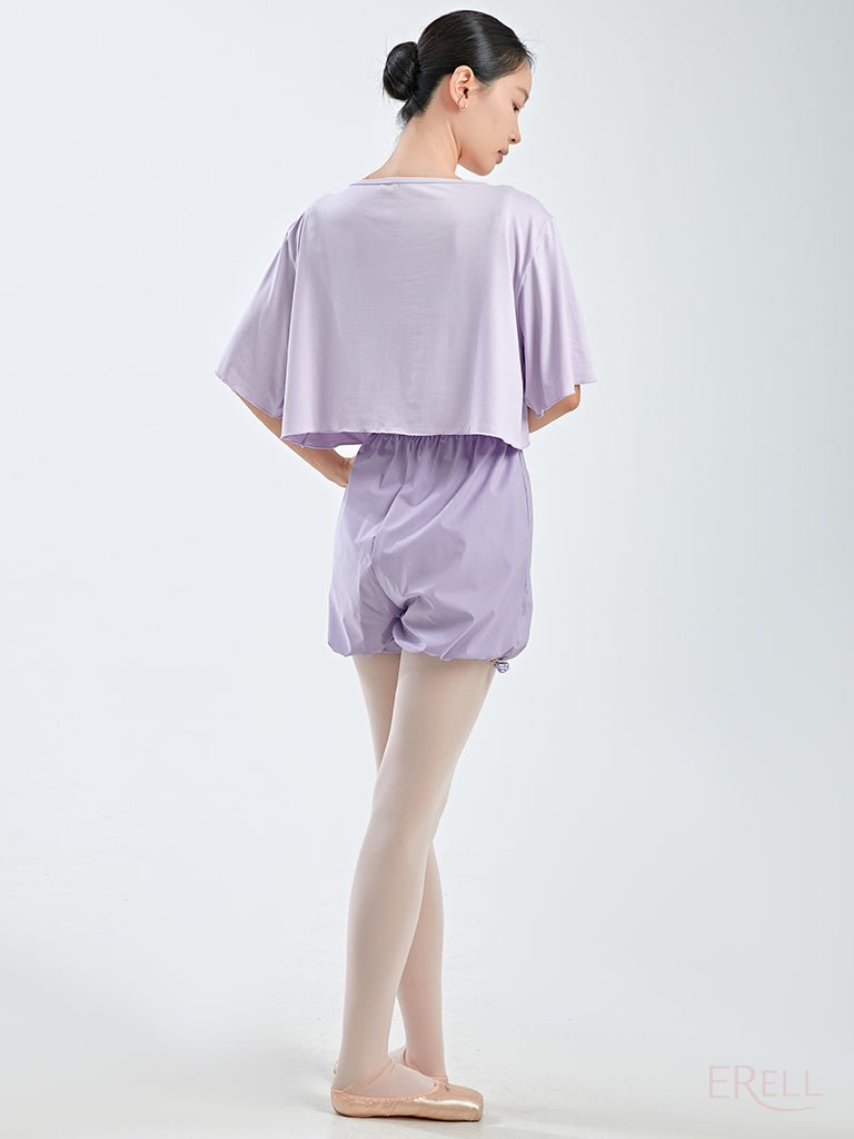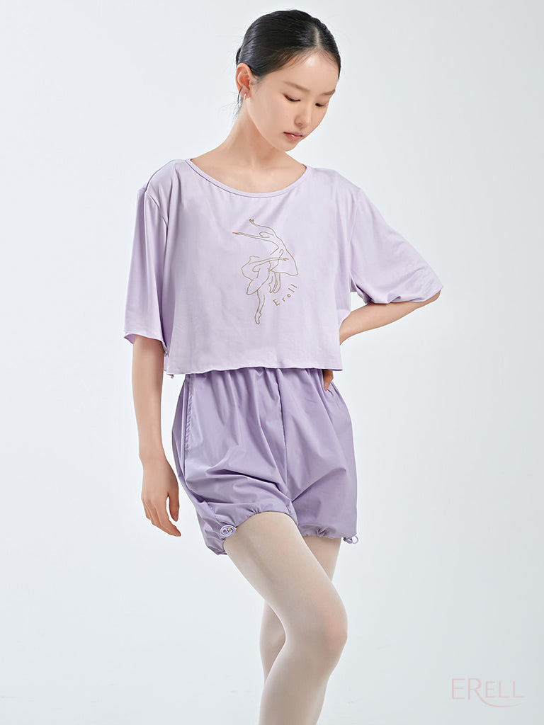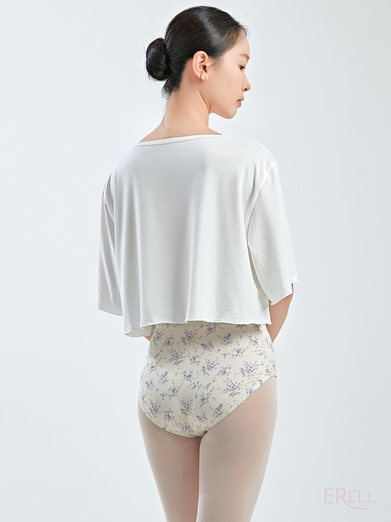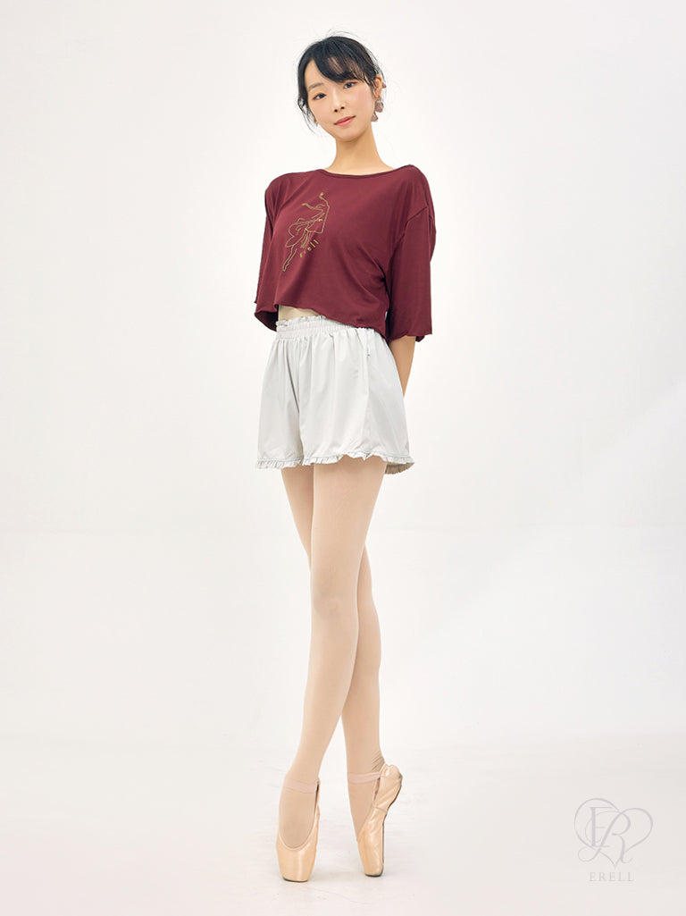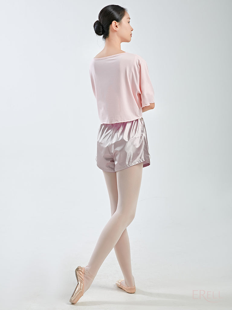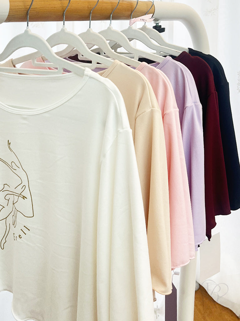 A loose-fit warmer top inspired by ballerinas, featuring a subtle gold print with a gentle shimmer.