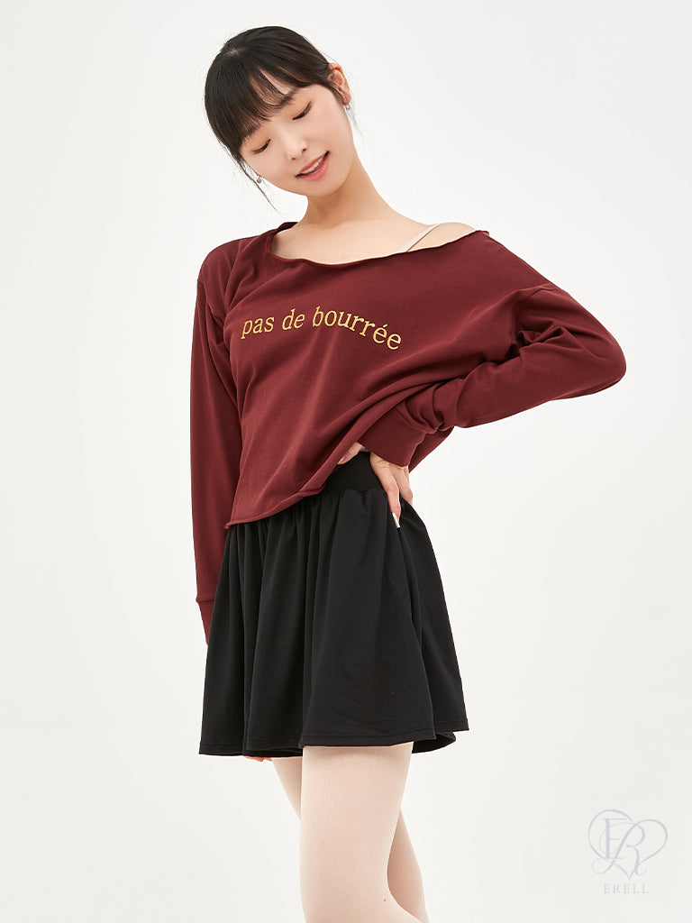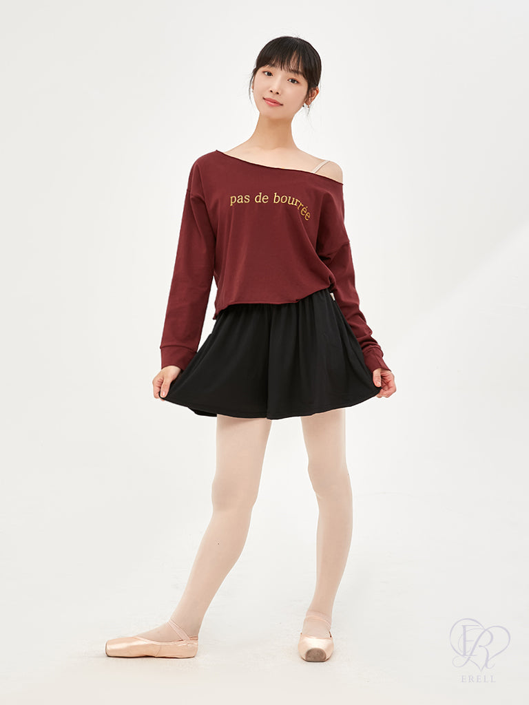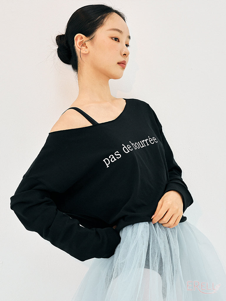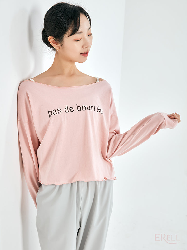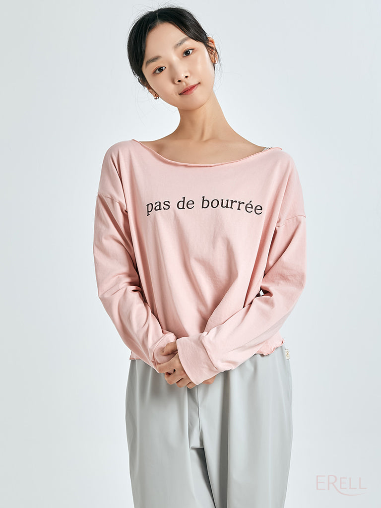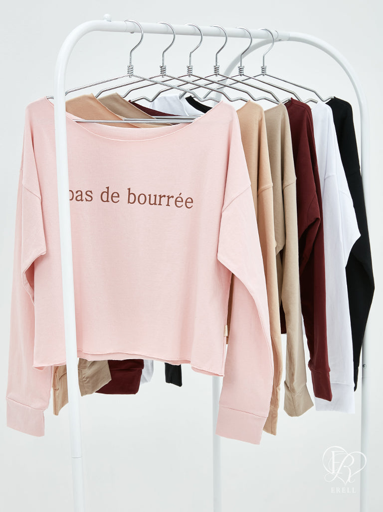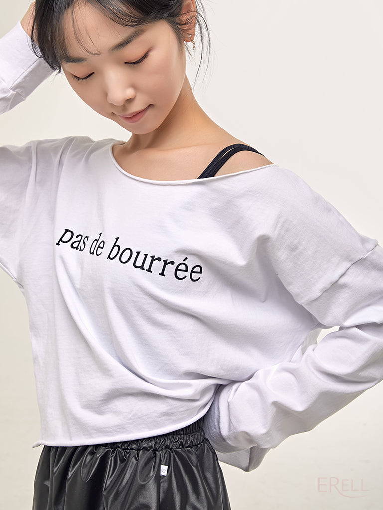 A semi-off-shoulder top featuring the phrase "pas de bourrée" in elegant lettering, designed to highlight the graceful curve of the shoulders.