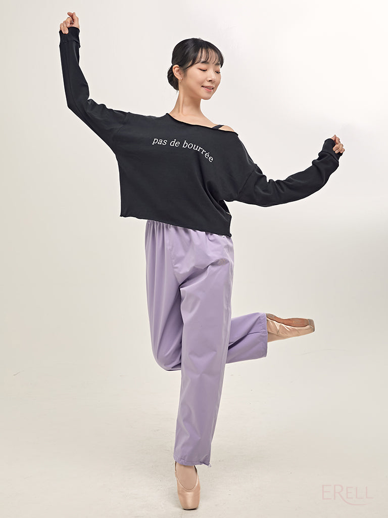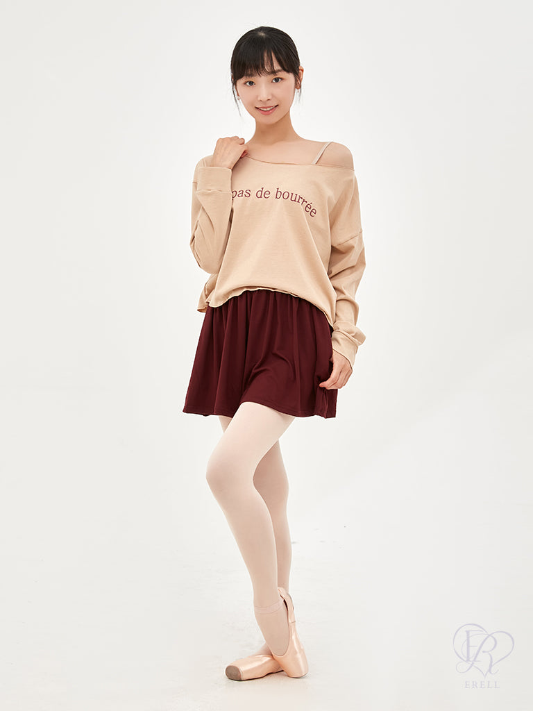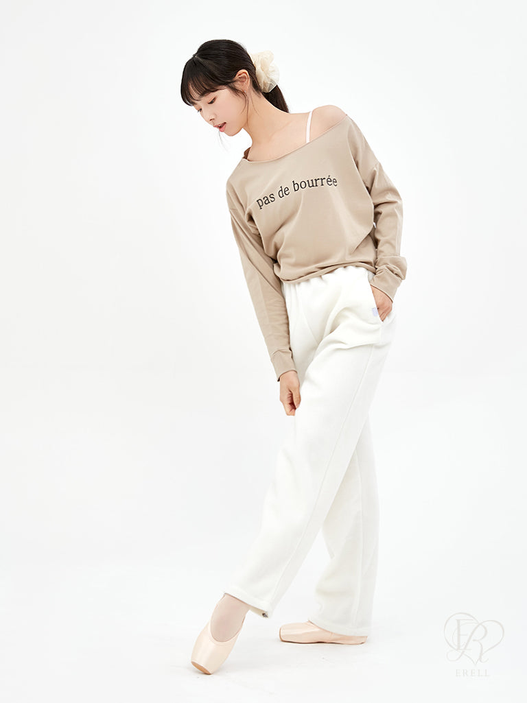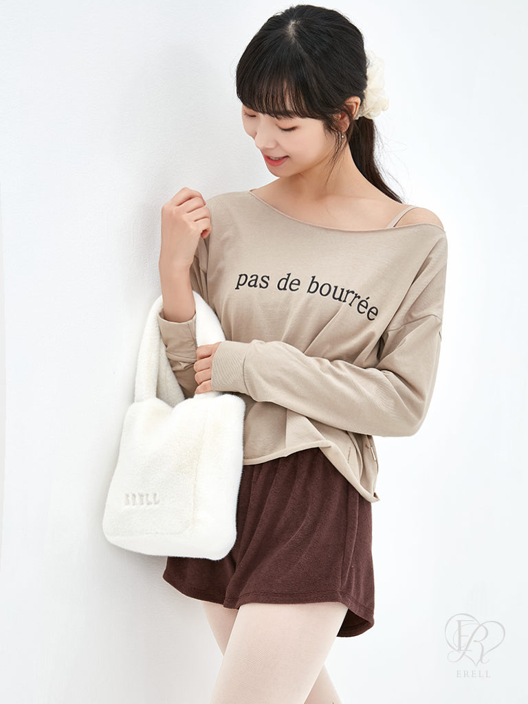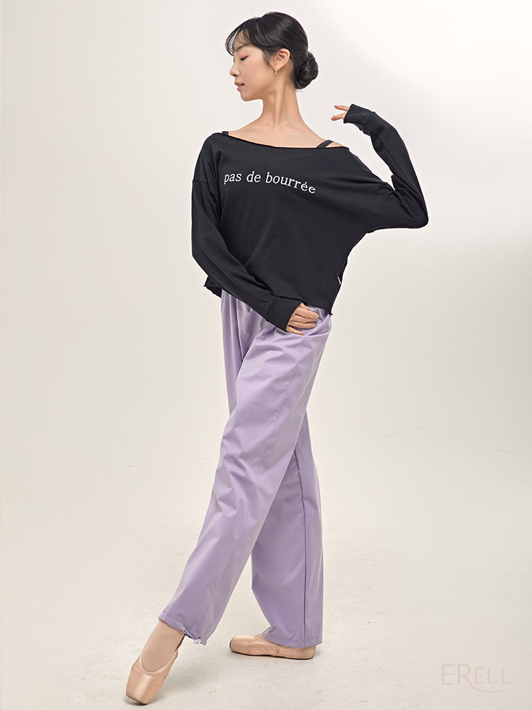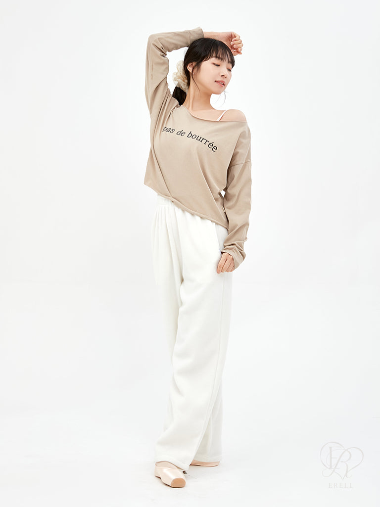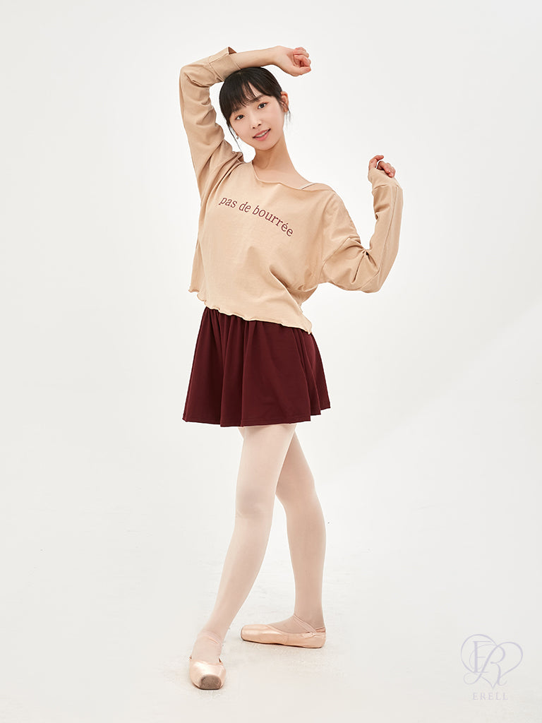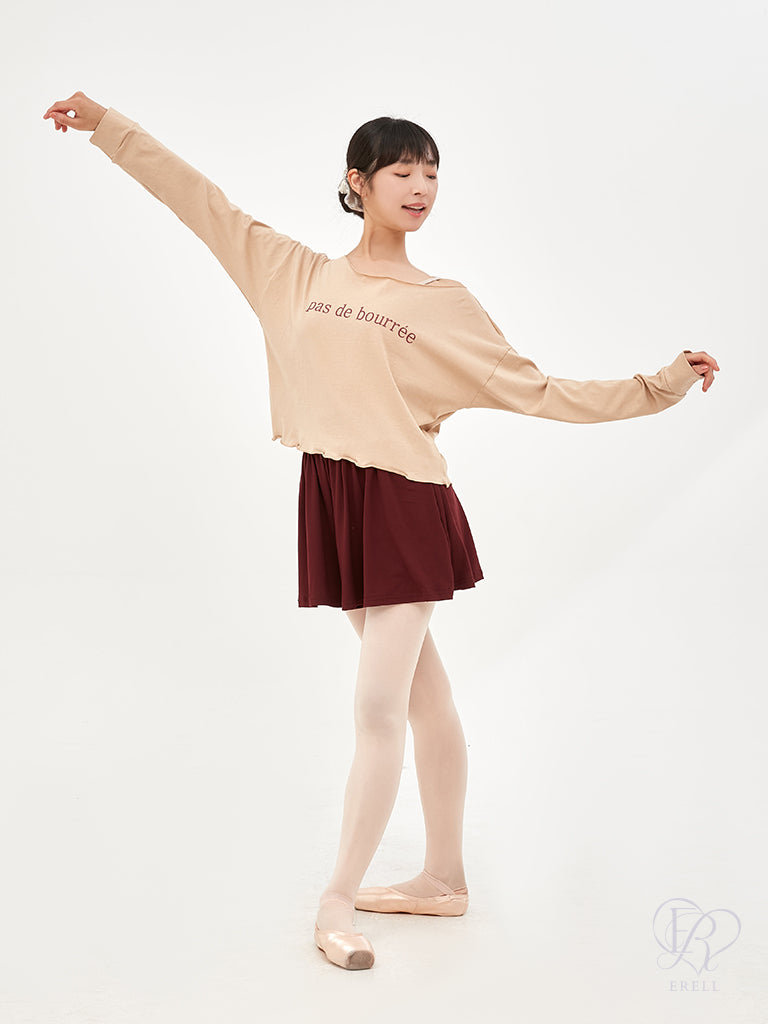 A semi-off-shoulder top featuring the phrase "pas de bourrée" in elegant lettering, designed to highlight the graceful curve of the shoulders.