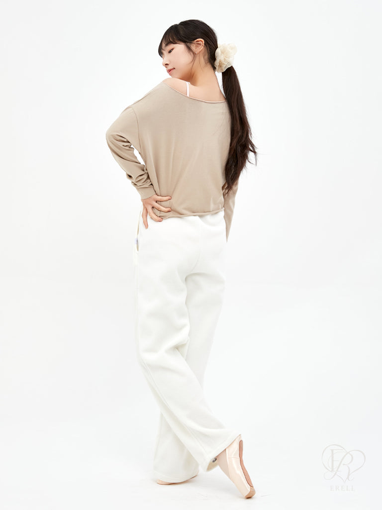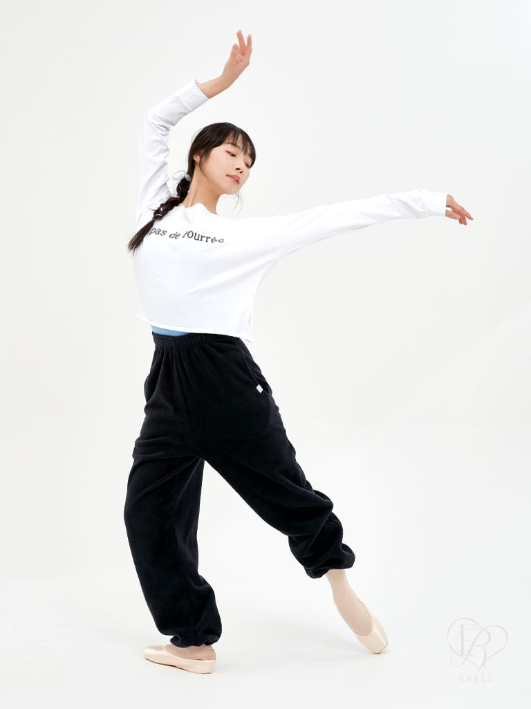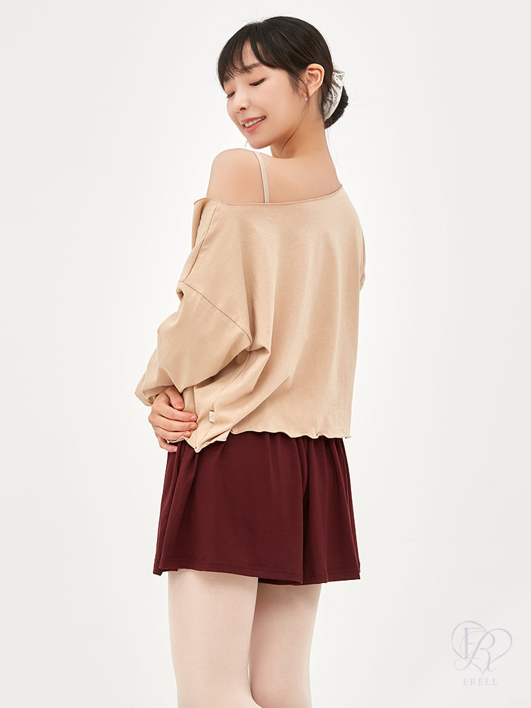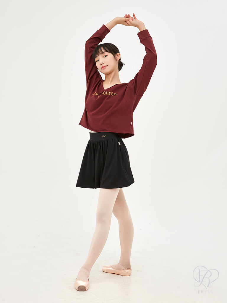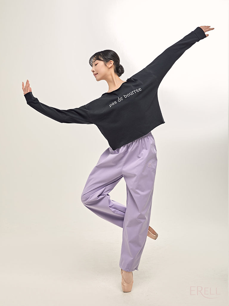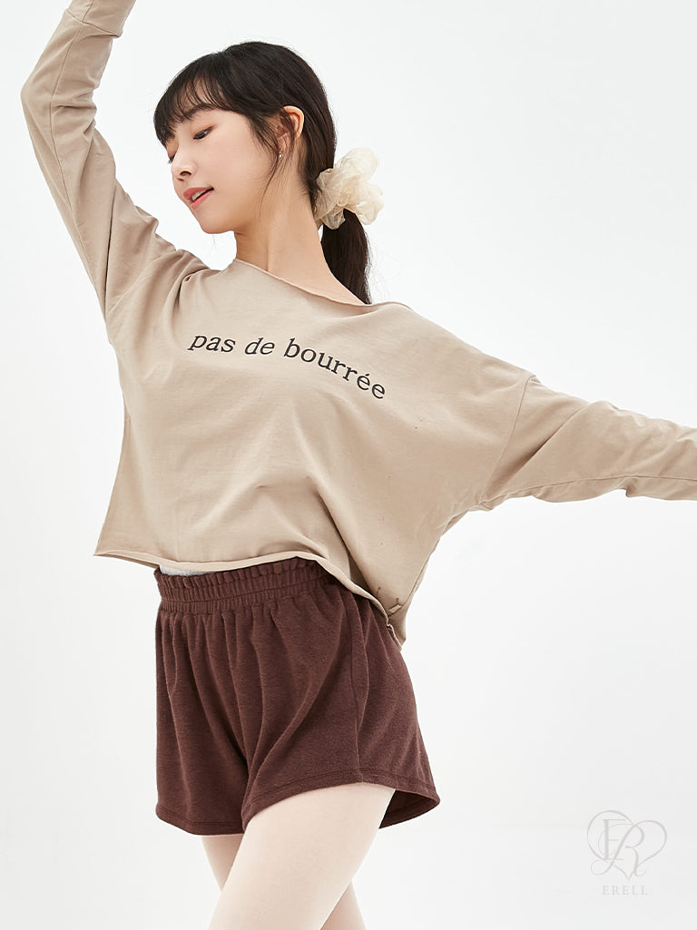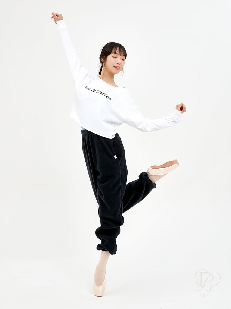A semi-off-shoulder top featuring the phrase "pas de bourrée" in elegant lettering, designed to highlight the graceful curve of the shoulders.