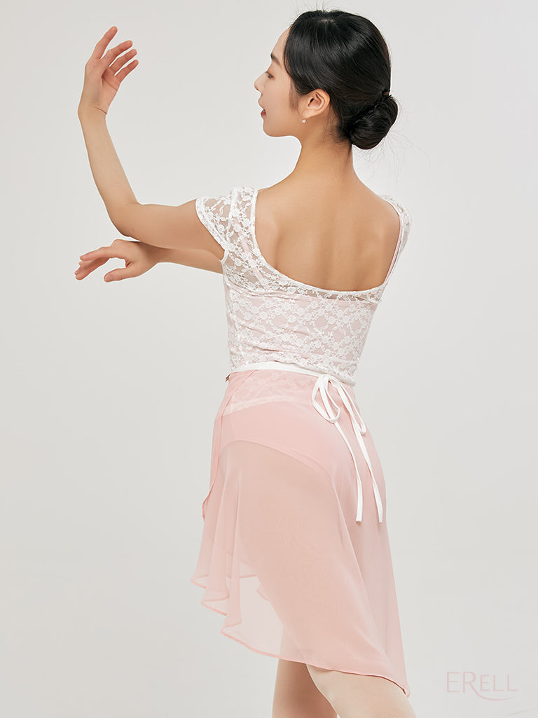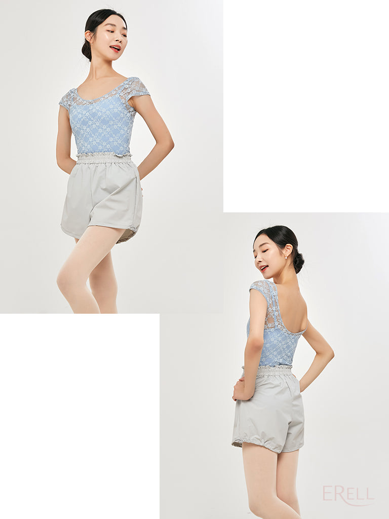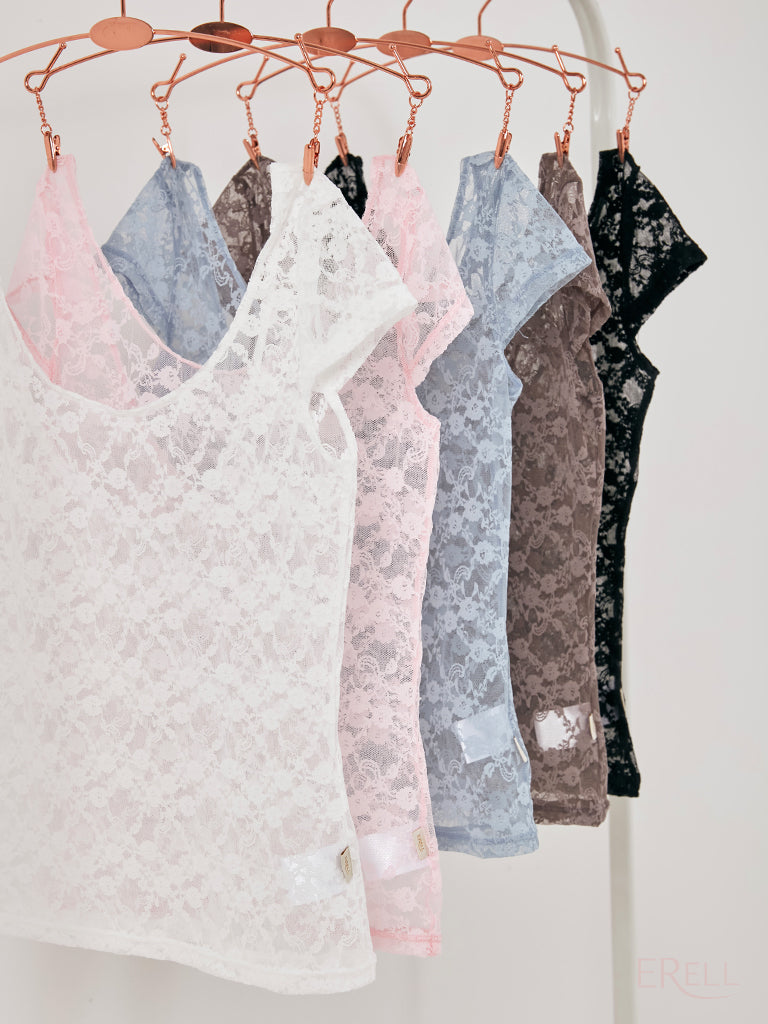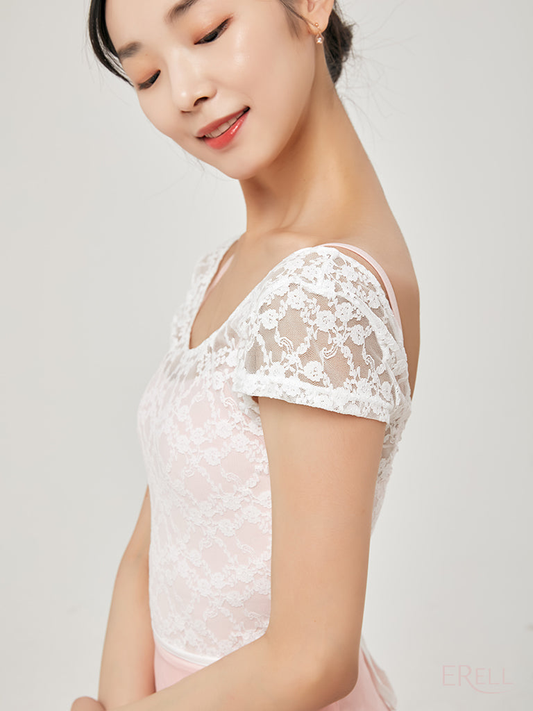 This short-sleeve top features a floral embroidered knit design and is made from lace-spandex fabric, offering a cool and airy feel while exuding an antique and lovely vibe.