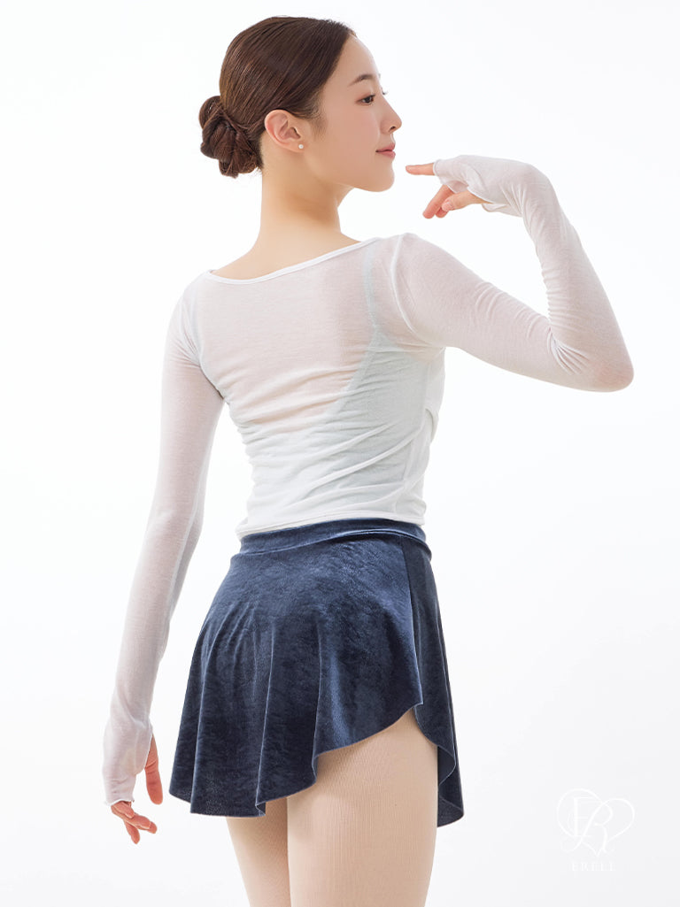 This is a pull-on skirt made of velvet span material that creates an elegant mood.