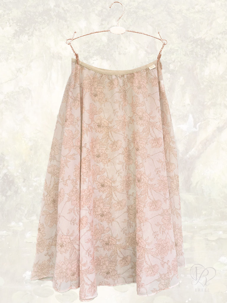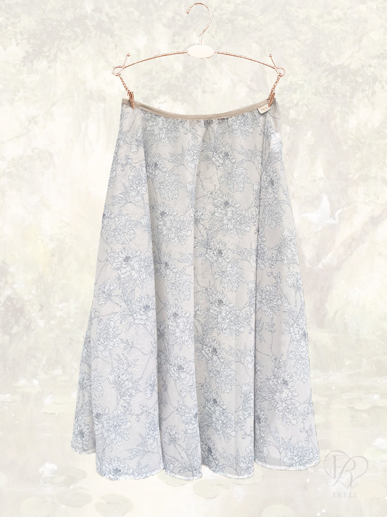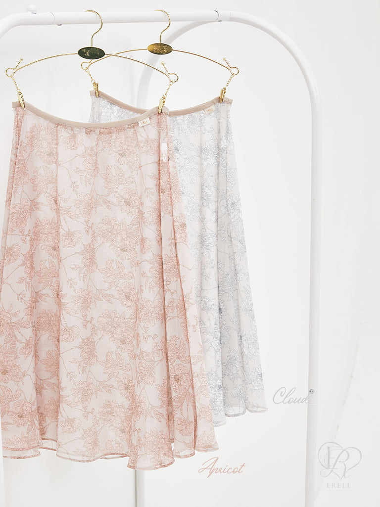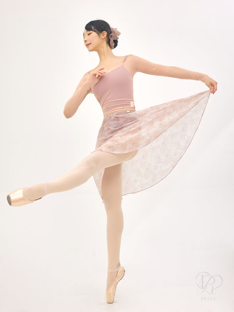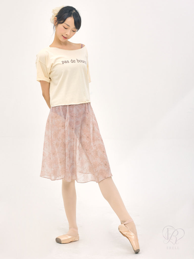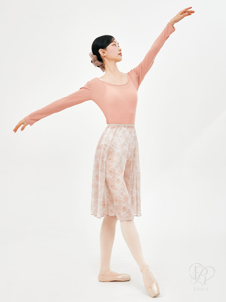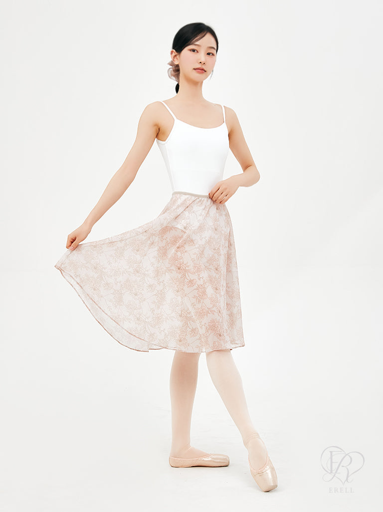 A 21-inch chiffon pull-on skirt designed with the pattern of ERELL’s best-selling Peony leotard.