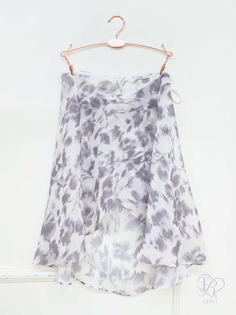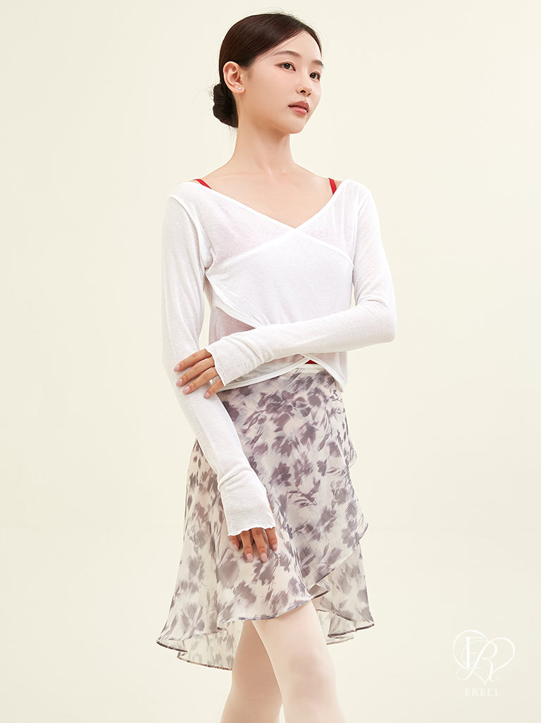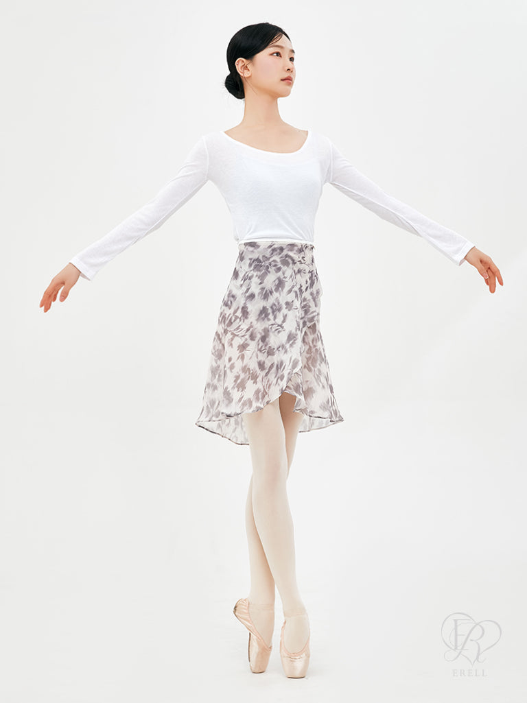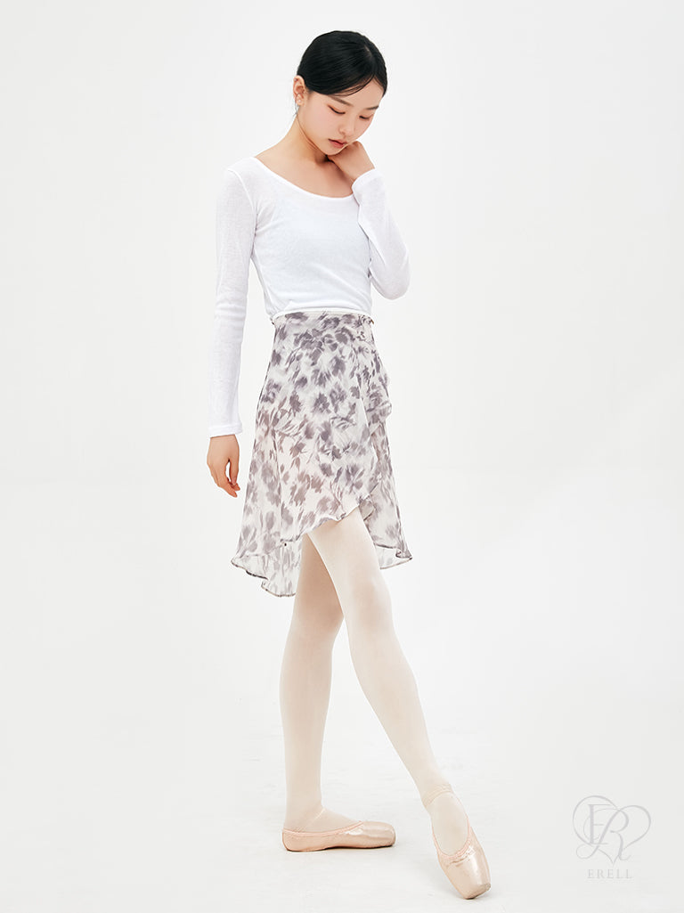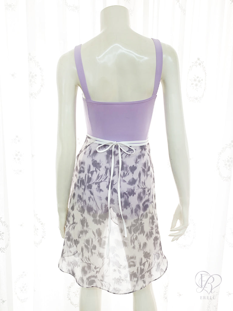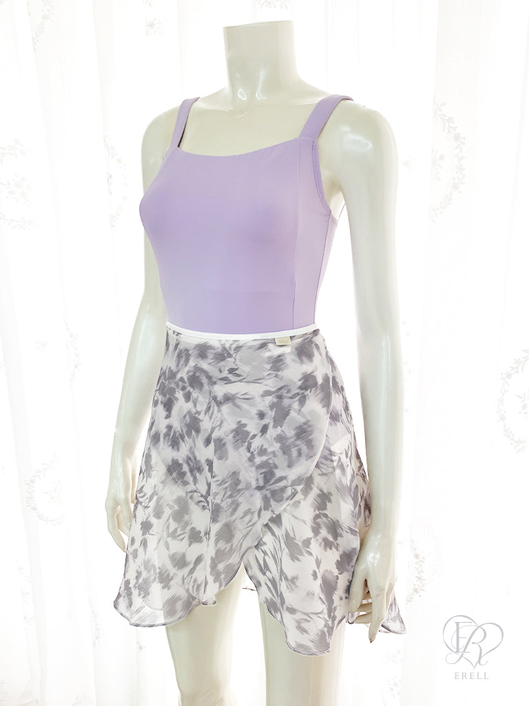 Crafted with a vertical crepe chiffon fabric in a purple and ash gray palette, this skirt brings an elegant touch while visually elongating and slimming the leg line.