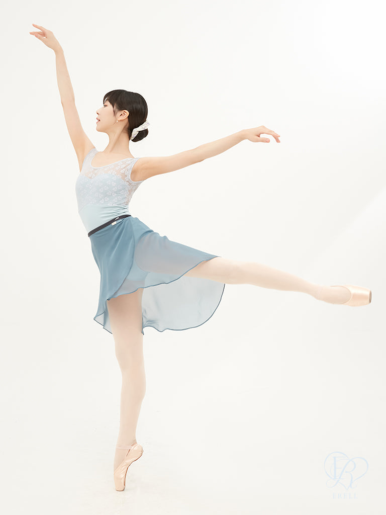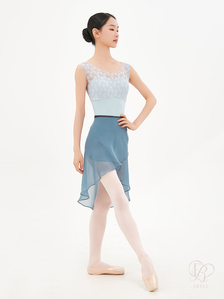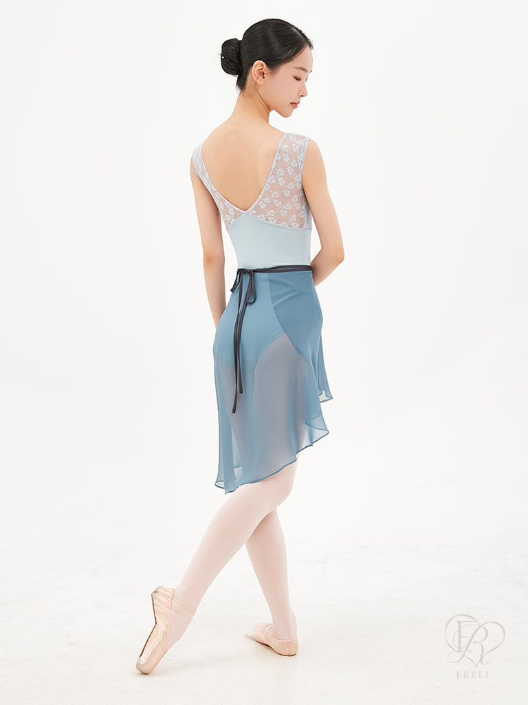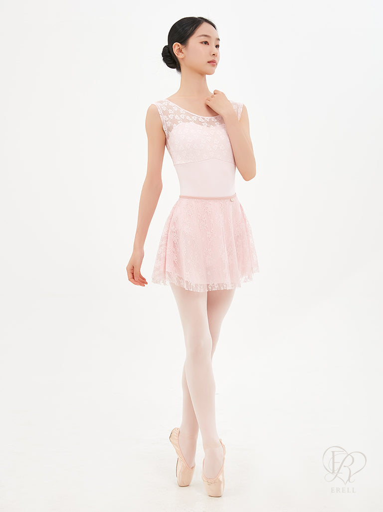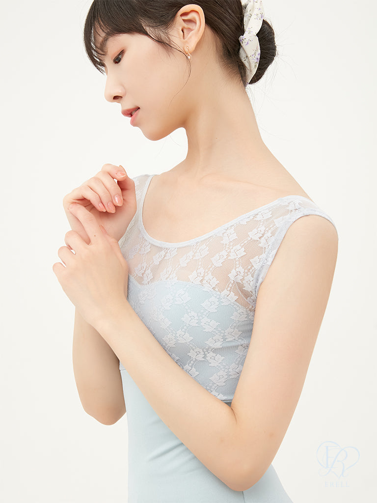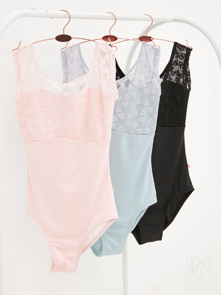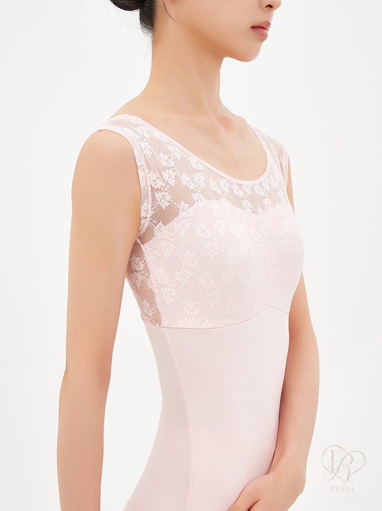 A tank‑style leotard adorned with delicate floral lace detailing.