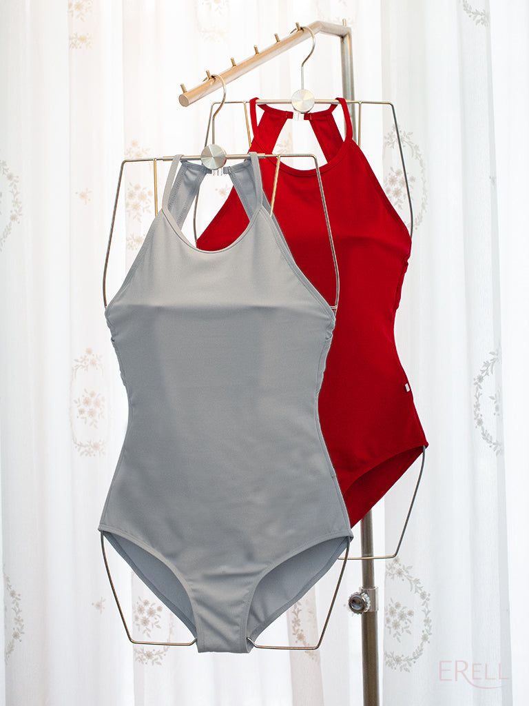 A halter-style leotard featuring a basic body silhouette and a comfortable standard leg cut.
